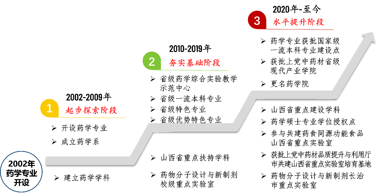 药学专业始建于2002年,二十余年来,先后获批省级特色专业、省级优势特色专业,省级一流本科专业、国家级一流本科专业建设点、药学学科为山西省重点建设学科。2021年获批药学硕士专业学位授权点。